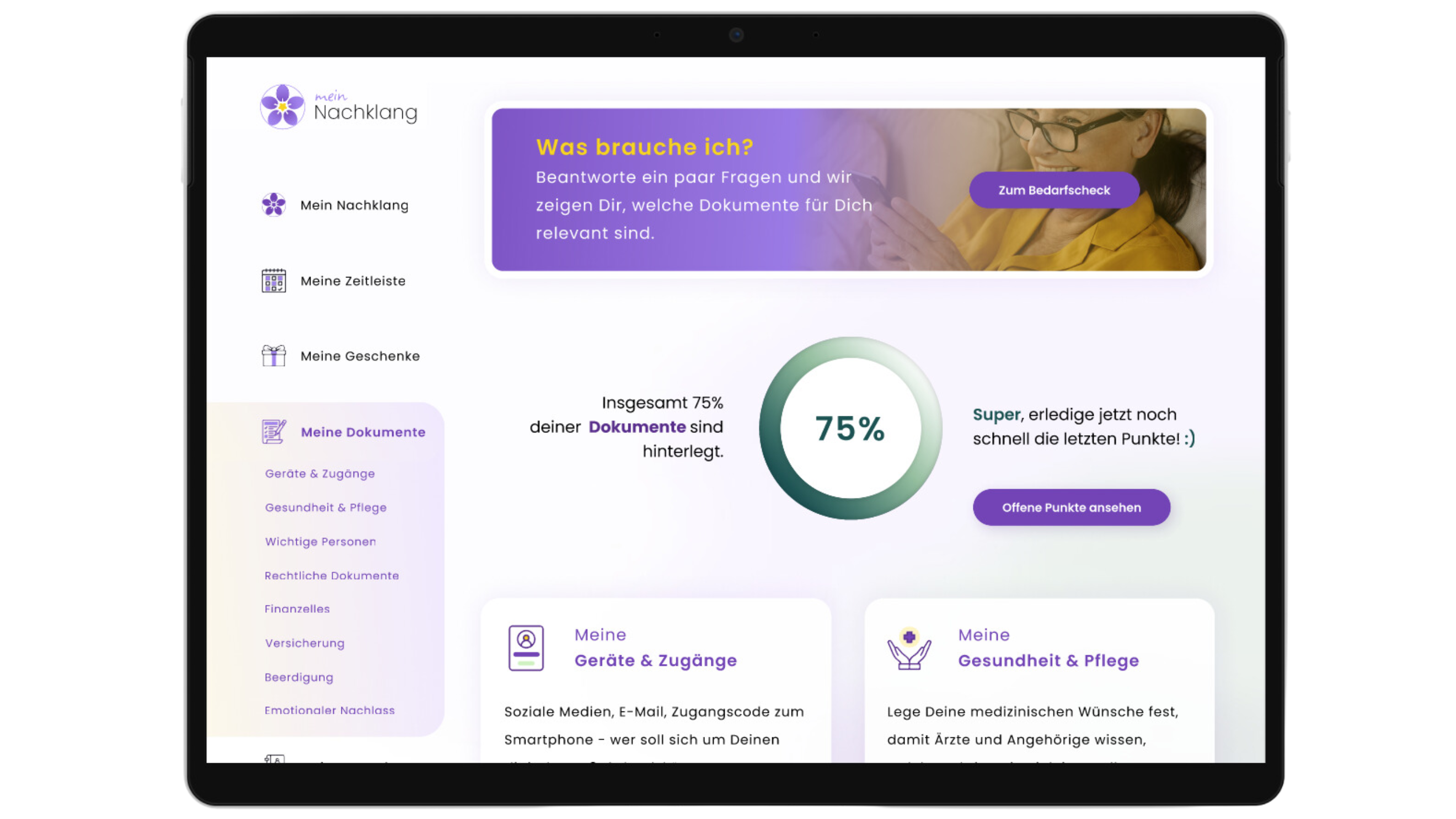 Woher weiß ich eigentlich, welche Dokumente ich für den Ernstfall alle benötige? Wir sagen’s Dir. Bei Nachklang erhältst Du übersichtliche Checklisten und Schritt-für-Schritt-Anleitungen, damit Du nichts vergisst.